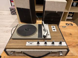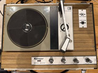 Tocadiscos vintage Königer 2500 Stereo con un diseño clásico. - Acabado en madera y detalles en beige. - Controles de balance, graves, agudos y volumen. Funciona bien para los años que tiene, le cambiaron la aguja recientemente, uno de los altavoces no suena tan bien como el otro