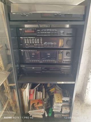Equipo de música con amplificador Yamaha y tocadiscos,el mueble tiene roto en la esquina el cristal por lo demás todo perfecto