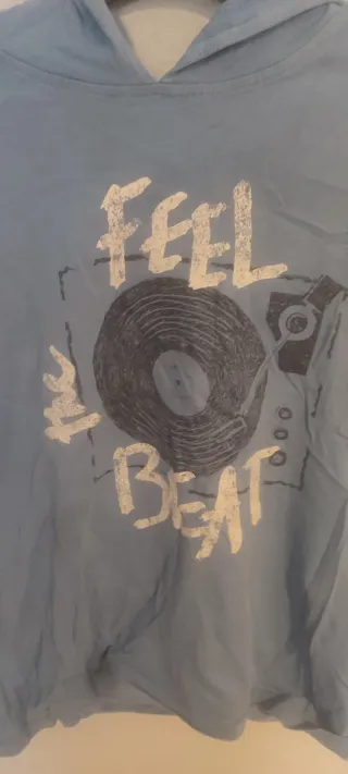 Camiseta de manga larga para niño con un diseño divertido. -talla 9-10 años - Estampado frontal con Feel Beat y un tocadiscos. - Cuello con capucha. - Manga larga.