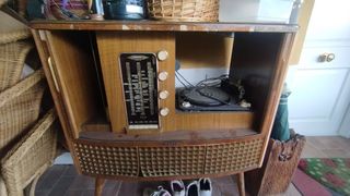 Tocadiscos vintage Berühmter Metrópoli 21. Año 1962. Precioso mueble clásico que se abre en altavoces a ambos lados y tocadiscos y fadio en la parte central. Tanto el tocadiscos como la radio funcionan siendo necesario reparar el motor del mecanismo de apertura.