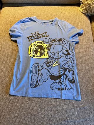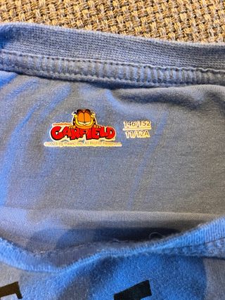 Camiseta de manga corta de Garfield para niño, talla 11/12A. Es de color azul claro y tiene un diseño chulo de Garfield con un tocadiscos. - Talla: 11/12A (146/152) - Marca: Garfield - Color: Azul claro - Diseño: Garfield con un tocadiscos