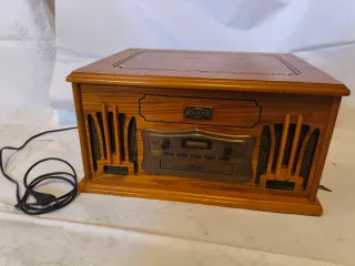 Mini cadena antigua de la marca Firstline en color negro. Incluye tocadiscos, radio y reproductor de cassette. - Diseño compacto y elegante. - Ideal para coleccionistas o amantes de la música retro.