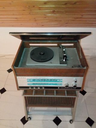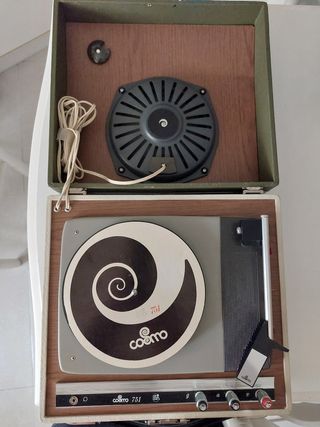 Se oye bien, pero no gira. Hay que repararlo o como decoración. Es de época con mando de sonidos graves, agudos y de volumen. Está preparado para ir a 220 V. Es el modelo Cosmo 751. Los agarres están perfectos. Sus medidas son 34x30x15 cm