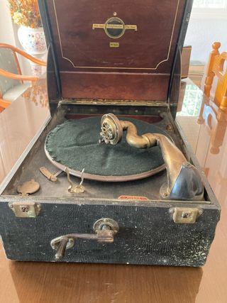 La maleta está un poco deteriorada por fuera, pero el gramófono funciona