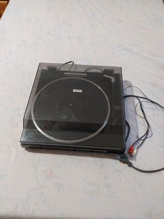 Tocadiscos con un diseño elegante y moderno. - Plato de vinilo con acabado moteado en gris y blanco. - Base de madera en tono marrón. - Tapa protectora transparente. Lo vendo por falta de uso