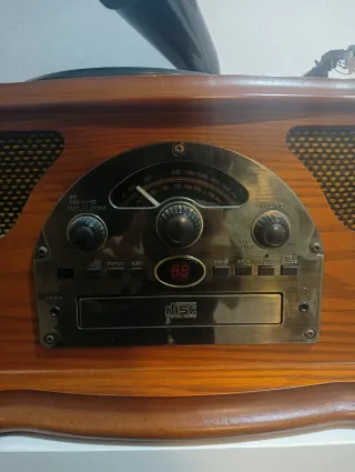 Vendo gramófono vintage Ricatech RMC350 Legend Music 5 en 1. Funciona perfectamente en todas sus funciones, características: -Fonógrafo tocadiscos RMC350 5 en 1 -Tocadiscos de 3 velocidades (33-45-78 RPM) -Reproductor de CD -Radio analógica AM/FM -Puerto USB y Ranura para la tarjeta SD -Fonógrafo clásico con altavoz extra incorporado -Altavoces estéreo: 2 x 2 Vatios -Dimensiones: (L) 44,3 X (P) 37,5 x (H) 64,8 cm -Peso: 6,4 kg -Alimentación: Corriente eléctrica Defectos a tener en cuenta: - La parte donde se enrosca el codo a la bocina se partió y está pegada (visible en la última foto) ¡Hazlo tuyo! Vivo en Murcia.