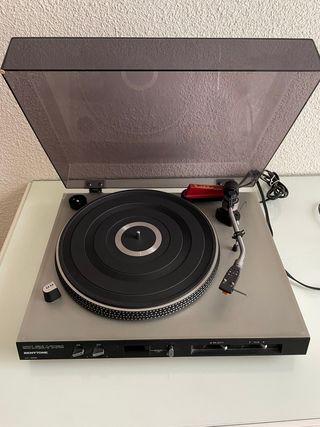 Tocadiscos de vinilo con diseño automático. - Plato giratorio. - Brazo de lectura. - Cubierta protectora transparente. Modelo F7112 Synchrd Drive. No tiene aguja, el plato gira pero no lo he probado con vinilo.