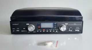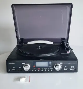 Tocadiscos Sunstech PRX2 en color negro. Permite la conversión de la música del disco a MP3 (en USB o tarjeta SD). Tiene mando a distancia e incluyo una aguja de repuesto. - Giradiscos con 3 velocidades: 33, 45 y 78 RPM. - Sistema de tracción por correa. Cápsula: MM (imán móvil) - Plástico cubre giradiscos extraíble. - Sintonizador digital FM estéreo readout. - Display LCD de color azul. - Altavoces estéreo integrados: 1,5W RMS x 2. - Bass Boost y speaker On/Off (desconecta altavoces) -RCA: salida de audio para amplificadores externos. - USB, lector de tarjetas SD / MMC y salida auric. - Grabación directa: giradiscos a USB/SD/MMC