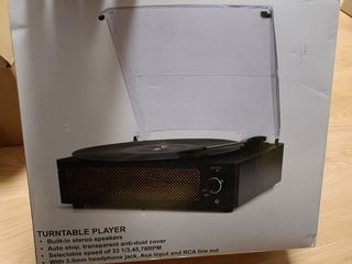 Reproductor de vinilos After en excelentes condiciones. - Tiene altavoces estéreo incorporados. - Parada automática y cubierta antipolvo transparente. - Velocidades seleccionables: 33 1/3, 45 y 78 RPM. - Conector para auriculares de 3,5 mm, entrada auxiliar y salida RCA.