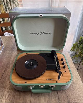 Tocadiscos portátil con conexión Bluetooth. Ideal para disfrutar de tus vinilos. - Diseño compacto y fácil de transportar. - Altavoces integrados.