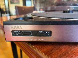 Tocadiscos Aiwa PX-E77 en color plata. Un sistema de plato giratorio automático. - Selector de velocidad 33/45 RPM. - Indicador de Power/Standby. Lo dejo a este precio porque lo único que tiene es que el boton “Start” no responde, pero se puede hacer manualmente sin ningún tipo de problema. El resto de botones van todos bien.