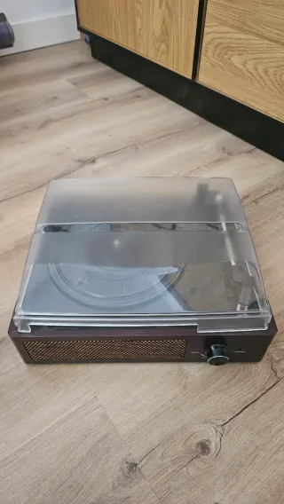 Tocadiscos con un diseño clásico y elegante. Tiene salida para escucharlo por altavoces y por cascos, además del altavoz propio que se escucha bastante decente. - Acabado en tonos marrones y grises. - Cubierta protectora transparente.