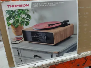 Sistema de microcadena Thomson con tocadiscos integrado. Diseño moderno y funcional. Producto sin usar en perfecto estado. - Reproductor de vinilos. - Tecnología Bluetooth. - Radio FM con 50 presintonías. - Lector de CD. - Puerto USB. - Entrada auxiliar 3.5mm. - Salida de audio. - Velocidad ajustable.