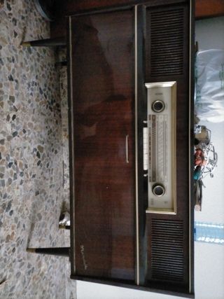 Pieza de colección de radio tocadiscos de los años 50. Un clásico que evoca la nostalgia de otra época. - Diseño de madera con detalles en metal. - Frontal con rejilla para altavoz. - Mandos y dial de sintonización característicos de la época.