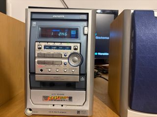 Se vende minicadena Aiwa XR-M121 en buen estado. Incluye dos altavoces. - Microcadena con reproductor de CD y casete. - Diseño compacto y elegante. - Perfecta para espacios reducidos. - Sistema estéreo compacto Aiwa XR-M121. Es una cadena musical que incluye un reproductor de CD (compatible con CD-R/RW), doble pletina de cassette con auto-reverse y sintonizador de radio. Cuenta con dos altavoces y una salida para auriculares, como se ve en la imagen. La potencia de salida es de 2x10W RMS (2x16W según la imagen).