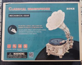 Gramófono de madera clásico Rokr, sin usar. Es un kit de construcción. - Mecanismo de engranajes. - Genera energía manualmente. - 3 velocidades: 33, 45 y 78 rpm. - Incluye un disco de vinilo de 7 pulgadas. - 420 piezas
