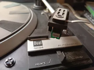 Tocadiscos Dual modelo 1234 en color negro.automatico. Funciona en manual, aguja para cambiar - Plato giratorio con base antideslizante. - Control de velocidad con selector de 33 y 45 RPM. - Brazo de lectura con contrapeso. - Palanca de inicio y parada.
