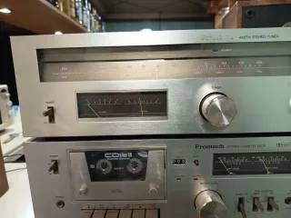 Se vende amplificador y sintonizador de la marca Frontech en color plateado. - Amplificador Integrado Estéreo. - Sintonizador AM/FM Estéreo. - Modelo TU-3000 y SA-3000. Funcionando, el amplificador necesita limpieza y los vumeters no terminan de ir bien Regalo pletina que rebobina y adelanta pero el play no funciona. Con tocadiscos Dual de mi perfil.100€
