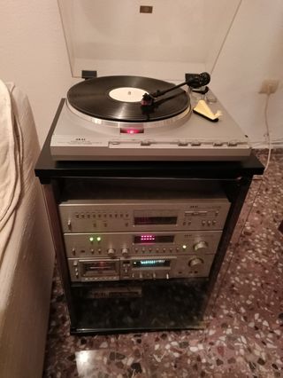 tocadiscos, pletina cassette, sintonizador y amplificador akai, hi-fi stereo. Se incluye mueble con ruedas. dispone de mando a distancia original.