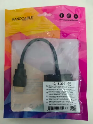 Este conversor te permite conectar dispositivos con salida HDMI a pantallas con entrada SVGA, incluyendo audio. - Conexión HDMI a SVGA. - Incluye conexión de audio jack 3.5/F. - Color: negro. - Longitud del cable: 10 cm. - incluye toma micro USB