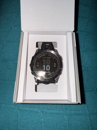 Reloj inteligente Garmin Fenix 7X Pro en color plata. Un dispositivo robusto y versátil para tus actividades. - Bisel de acero inoxidable. - Correa de silicona negra. - Pantalla táctil y botones.