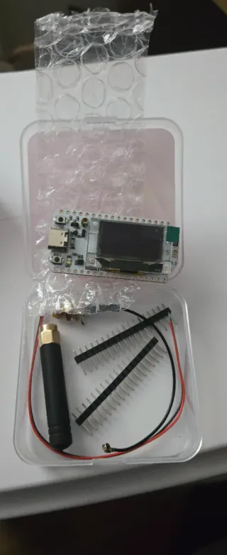 Kit de desarrollo Lora 32 con accesorios. - Placa Lora 32 con pantalla. - Antena. - Pines de conexión.