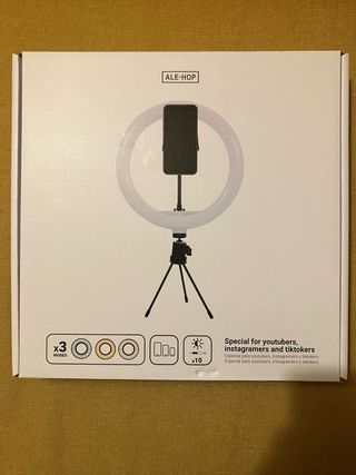 Anillo de luz LED con trípode, ideal para creadores de contenido. - 3 modos de luz. - 10 niveles de brillo. - Soporte para móvil.