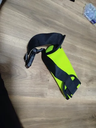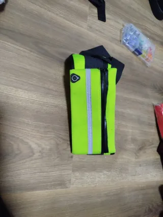Riñonera deportiva de color verde fluorescente con detalles reflectantes y cremallera negra. Diseñada para llevar el móvil y otros objetos pequeños. - Material: Neopreno. - Cierre de cremallera. - Salida para auriculares.