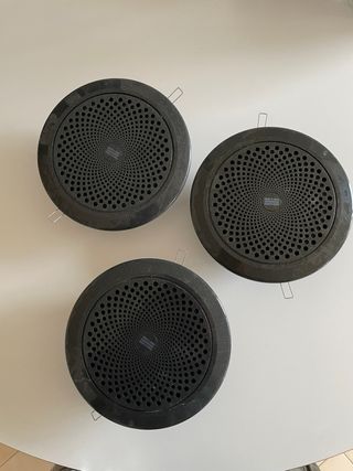 Set de tres altavoces redondos diseñados para sistemas de hilo musical. Su rejilla frontal presenta un patrón circular concéntrico. - Diámetro estándar para empotrar. - Rejilla protectora con diseño. - Sistema de fijación integrado.