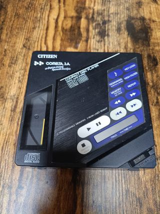 Reproductor de CD portátil Citizen CBM-1000, fabricado en Japón en mayo de 1987, uno de los primeros modelos de discman de diseño plano. Equipo vintage con estética muy ochentera y tecnología clásica de los inicios del CD portátil. ✔️ Modelo CBM-1000 ✔️ Fabricado en Japón ✔️ 3-Beam Laser Sensor ✔️ Memoria programable ✔️ Distribuido en España por Comelta S.A. Importante: – Se vende solo la unidad – No incluye cargador ni auriculares – Funcionamiento no comprobado recientemente - No lo he conseguido arrancar Ideal para colección, restauración o exposición. Se vende tal cual se muestra en las fotos.