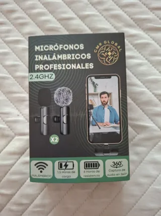 Set de dos micrófonos inalámbricos profesionales CMR GLOBAL. - Conexión 2.4GHZ. - Incluye 2 micrófonos. - Carga de 1.5 horas. - Resistencia de 6 horas. - Captura de audio en 360°.