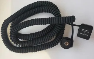 Alargador de flash dedicado para cámaras Canon con tecnología ETTL. Tiene una longitud de 5 metros y un diseño en espiral. - Conexión para flash. - Soporte con rosca para trípode.