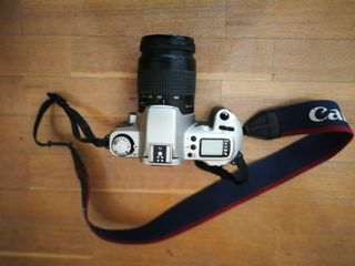 Cámara réflex analógica Canon EOS 300V en color plateado. Pack incluye objetivo 70-300mm, trípode 1m alto y fundas de equipos. Canon EOS 300V es una cámara réflex de 35 mm con una amplia gama de funciones y capacidades. Está equipada con un sistema de enfoque automático y una gama de modos de programa. Tiene flash incorporado, avance automático de la película, modo de exposición múltiple, previsualización de la profundidad de campo, una velocidad de obturación máxima de 1/2000 y un sistema de enfoque doble.