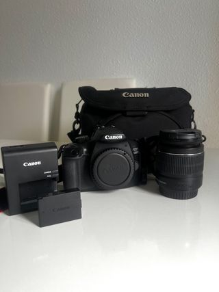 Cámara réflex digital Canon EOS 2000D en color negro. Incluye trípode Hama. - Sensor CMOS APS-C de 24.1 MP. - Pantalla LCD de 3 pulgadas. - Grabación de vídeo Full HD. - Conectividad Wi-Fi y NFC. Practicamente sin uso. El tripode esta nuevo sin uso