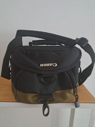 porta camara de fotos. marca CANON. bolsillo exterior e interior. lleva cinturon para colgarselo como una riñonera. color negro y franja verde oliva.