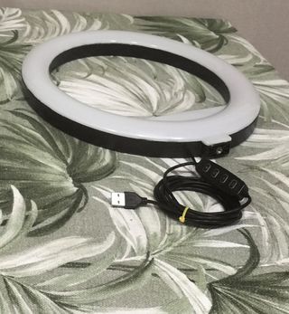 Aro de luz LED circular con un trípode plegable y un soporte ajustable para teléfono móvil. - Aro de luz LED blanco. - Trípode negro con patas plegables. - Soporte para teléfono móvil. - Cable de alimentación USB con control. Usado una vez. comprado en el alehop