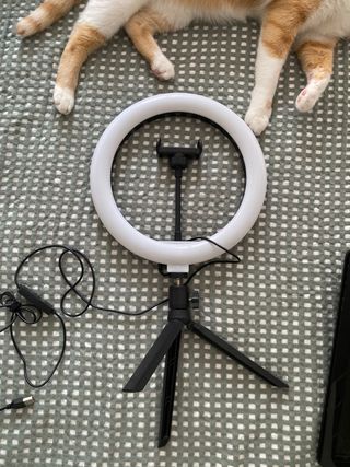 Aro de luz LED con trípode, ideal para selfies y videos. Está en perfectas condiciones. - Incluye aro de luz, trípode y control remoto. - Iluminación LED regulable. - Trípode ligero y fácil de transportar. - Perfecto para streaming, maquillaje o fotos.