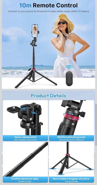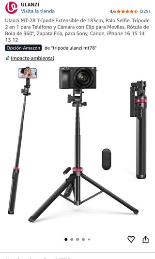Trípode extensible Ulanzi MT-78 de 183cm, versátil y práctico. - Diseño 2 en 1: funciona como trípode y palo selfie. - Incluye clip para teléfonos móviles. - Rótula de bola con giro de 360°. - Zapata fría para cámaras. - Incluye control remoto.