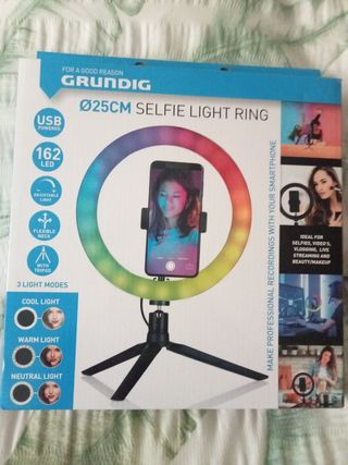 Aro de luz LED para móvil, perfecto para selfies y vídeos. Está en muy buen estado y funciona correctamente. - Iluminación LED regulable. - Soporte para móvil incluido. - Trípode ligero y fácil de transportar. - Ideal para streaming, maquillaje o videollamadas.