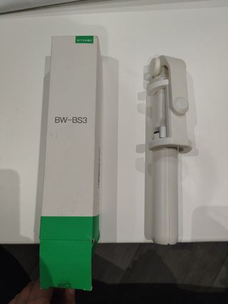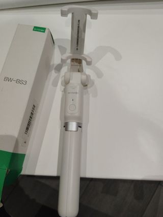 Palo selfie con trípode incluido. Bluetooth remoto. El mando usa pila cr2032 no incluida. En su caja original aunque la caja está algo deteriorada, pero el palo selfie está en perfecto estado.