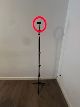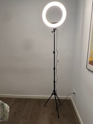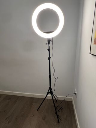 Aro de Luz LED Soft Ring con Trípode Aro de luz LED Soft Ring de 43 cm de diámetro con trípode ajustable, ideal para fotografía y vídeo. Está en perfecto estado, prácticamente sin uso - Aro de luz LED circular. - Trípode ajustable en altura hasta 230 cm. - Cable de alimentación. - Potencia 55 W - Regulable 3200k - 6000 k (controles independientes traseros) - Mando a distancia incluido - Dos soportes adicionales de móvil incluidos en el precio - Bolsa incluida en el precio