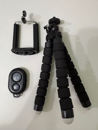 Este set incluye un trípode flexible con rótula y un disparador remoto. - Trípode con patas segmentadas y recubiertas de espuma. - Rótula con ajuste para móvil. - Disparador remoto con botones para Camera360 y IOS.