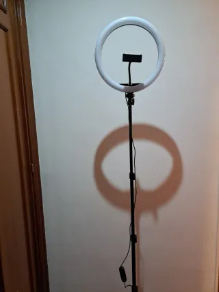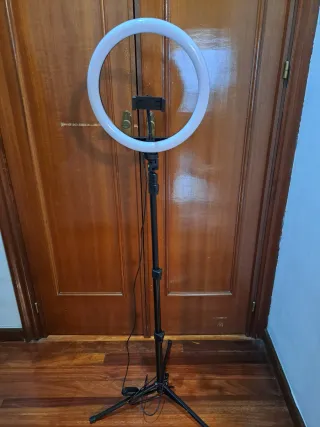 Aro de luz con trípode ajustable, ideal para fotografía o video. - Aro de luz circular. - Trípode con altura regulable. - Soporte para móvil integrado. Sin usar. No se realizan envíos.