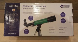 Telescopio refractor JUGUETTOS, ideal para principiantes en astronomía. Es un telescopio muy fácil de usar. - Lente óptica de cristal. - Aumentos de 18x y 90x. - Oculares intercambiables de 20 mm y 6 mm. - Trípode de aluminio. - Altura de 47.5 cm.