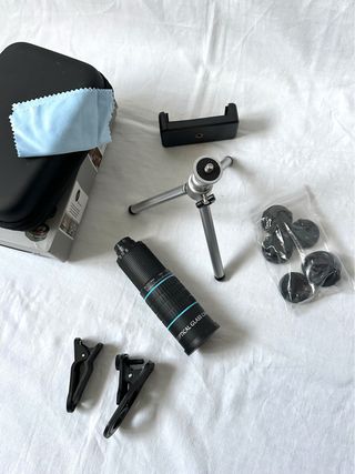 Kit de lente para iPhone con accesorios. - Lente óptico. - Trípode pequeño. - Soporte para teléfono. - Pinzas de sujeción. - Paño de limpieza.