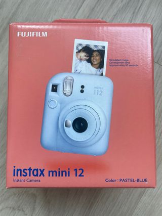 Cámara instantánea Fujifilm Instax Mini 12 en color azul pastel. Ideal para capturar momentos de forma divertida y obtener fotos al instante. - Modelo: Instax Mini 12 - Color: Pastel Blue - Tipo: Cámara instantánea