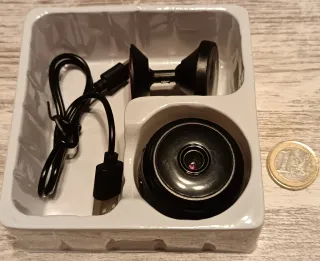 Pequeña cámara IP en color negro, ideal para vigilancia o monitoreo. - Diseño compacto y discreto. - Incluye cable de carga USB. - Soporte de montaje.