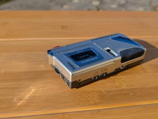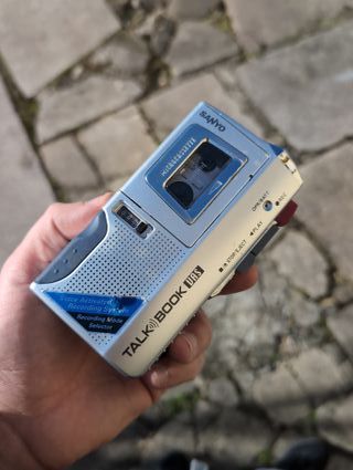 Grabadora de voz Sanyo TalkBook en color plateado y negro. - Micro casette - Función de detección de sonido - Diseño compacto y portátil. - Botones de control de fácil acceso.