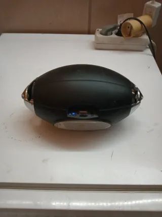 Altavoz portátil con un diseño deportivo. - Acabado en color negro y detalles plateados. - Forma ovalada que recuerda a un balón. -(No es jbl) -Se puede conectar de distintas formas, Bluetooth, usb, tarjeta SD, puerto auxiliar -carga tipo D