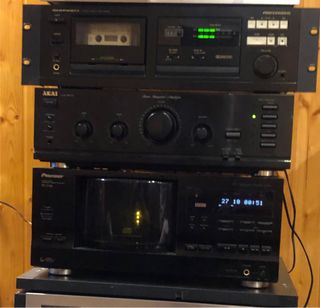 Conjunto de equipos de audio de alta fidelidad. - Amplificador Akai AM25 Potencia de salida: 60 vatios por canal a 8 Ω (estéreo), respuesta de frecuencia: 20 Hz a 20 kHz, factor de amortiguación: 35, sensibilidad de entrada: 3 mV (MM), 150 mV (línea), relación señal/ruido: 75dB (MM), 100dB (línea), separación de canales: 60dB (línea), impedancia de carga del altavoz: 4 Ω a 16 Ω Dimensiones: 425 x 130 x 270 mm Peso: 9 kg. - Pletina Marantz PDM 501 Profesional Reversible.